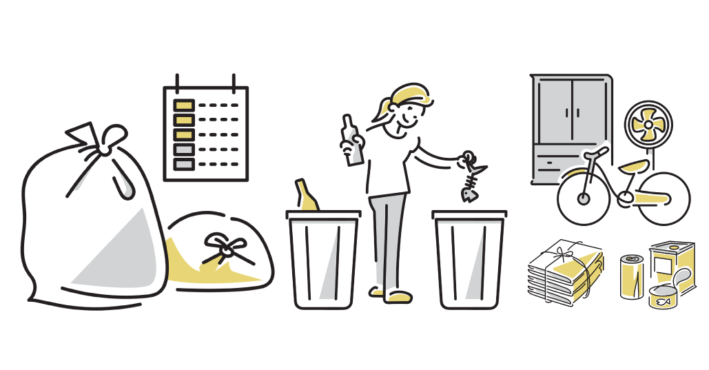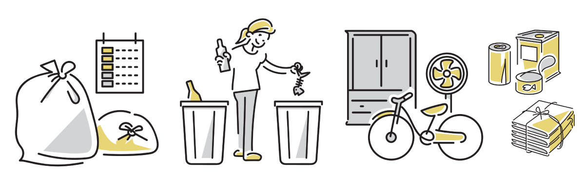 集積所回収(古紙、びん・缶、ペットボトル、プラスチック)/拠点回収(乾電池・コイン電池、小型充電式電池、小型家電、廃食油、ハブラシ、ペットボトルキャップ、使い捨てコンタクトレンズ空ケース)/集団回収/イベント回収など