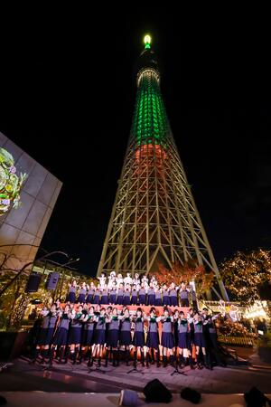 トップの星とカラフルなクリスマスイルミネーションであしらわれた東京スカイツリーを背景に、44名の団員が今回のゲストCANDY TUNEのみなさんと一緒にクリスマスソングを合唱しました。