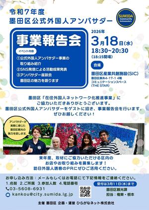本年度任命している「墨田区公式外国人アンバサダー」をゲストに招き、本事業の1年間の成果を発表する「令和7年度墨田区公式外国人アンバサダー事業報告会」を開催します。皆様のご参加お待ちしてます。