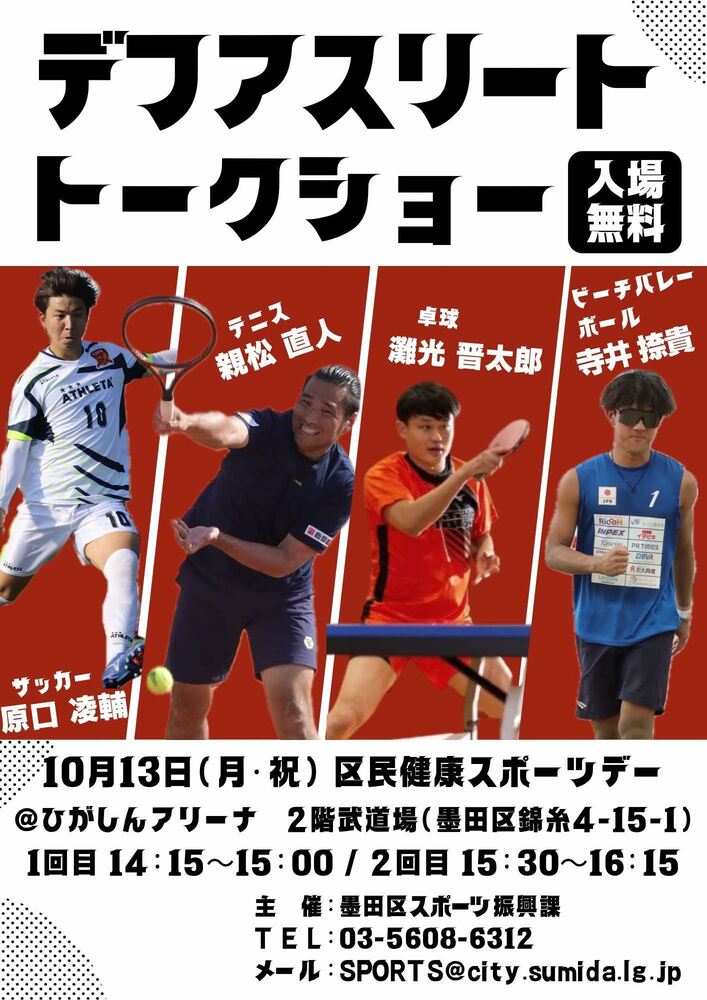 ひがしんアリーナで開催される「区民健康スポーツデー」の特別企画として、「デフアスリートトークショー」を開催します!