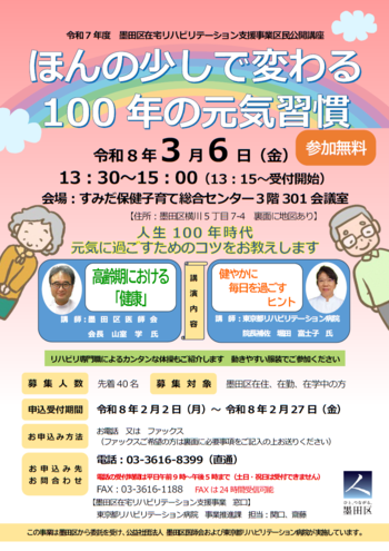 区と公益社団法人墨田区医師会、東京都リハビリテーション病院の共催で、「区民公開講座 ~ほんの少しで変わる100年の元気習慣~」(無料) を開催します。