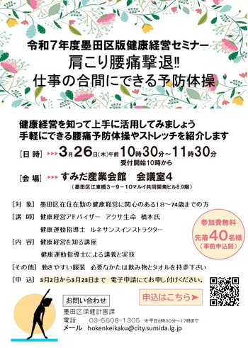 【募集前】第2回 墨田区版健康経営セミナー 肩こり・腰痛撃退!!仕事の合間にできる予防体操