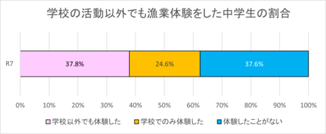 令和6年度の結果と比べると、学校以外で農業・漁業体験をしたことがある中学生の割合は、農業で4.1%減少し、漁業で3.6%g減少しました。