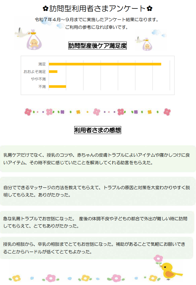 ご自宅に区が契約している助産師が訪問し、乳房ケアや授乳指導、産婦の心身や乳児の発育発達等に関する相談をすることができます。