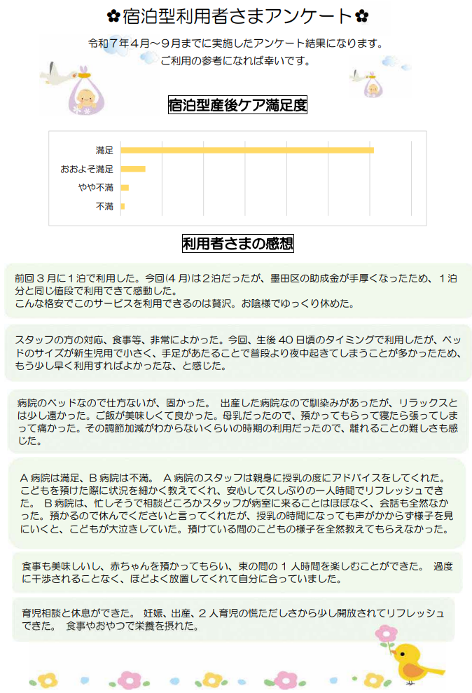 医療機関等の施設に宿泊して産後の休息をとりながら、乳房ケアや授乳、沐浴等の指導、産婦の心身や乳児の発育発達等を相談することができます。