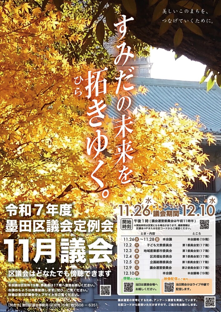 令和7年度定例会11月議会を、11月26日(水曜日)から12月10日(水曜日)までの15日間にわたって開会します。