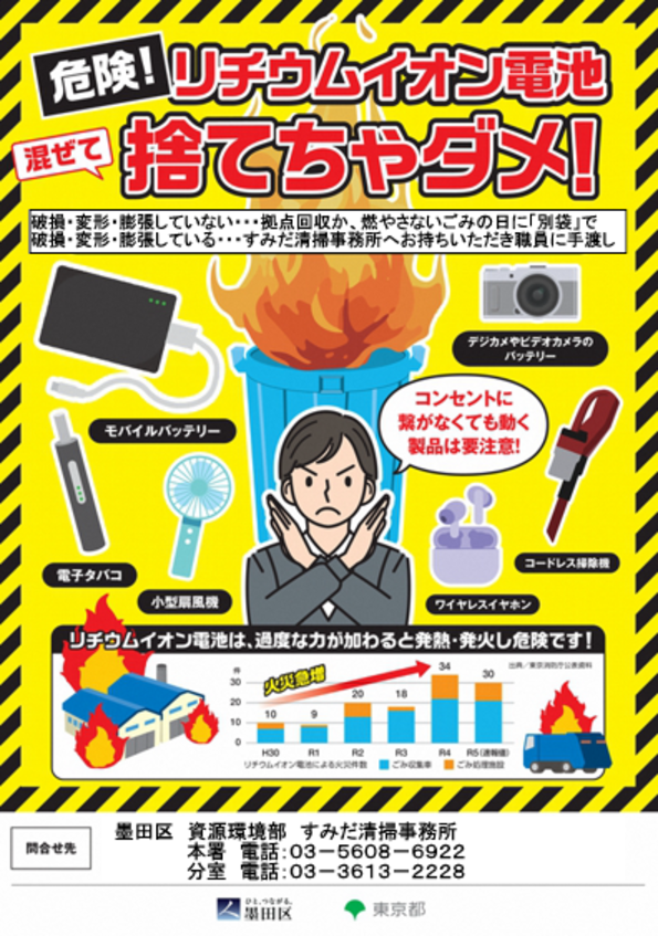 破損・変形・膨張した小型充電式電池(リチウムイオン電池、ニカド電池、ニッケル水素電池)、モバイルバッテリー、二次電池を内蔵した小型家電製品を処分する場合は、小型充電式電池リサイクルBOXや小型家電回収ボックスにお出しにならず、区内2か所にある清掃事務所までお持ちになり、職員に手渡してください。