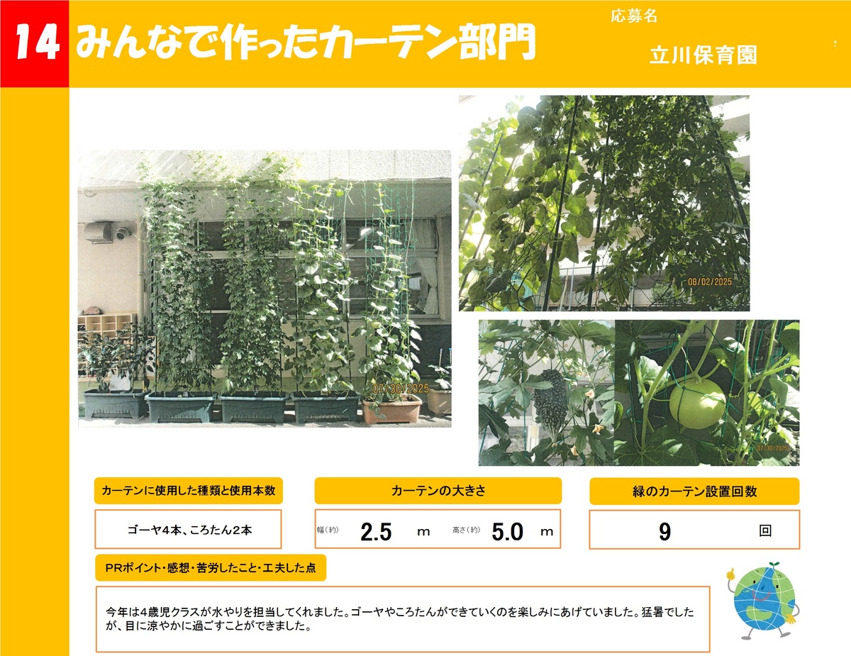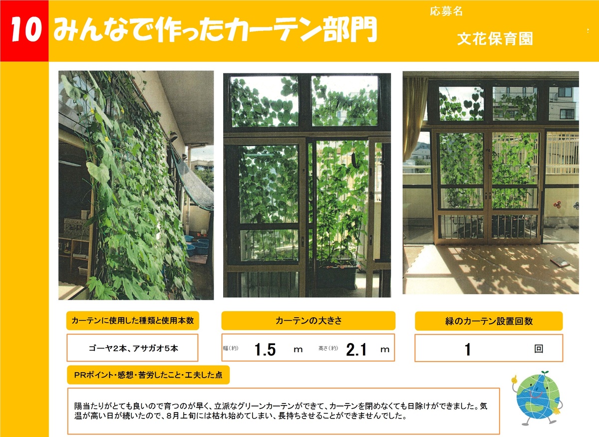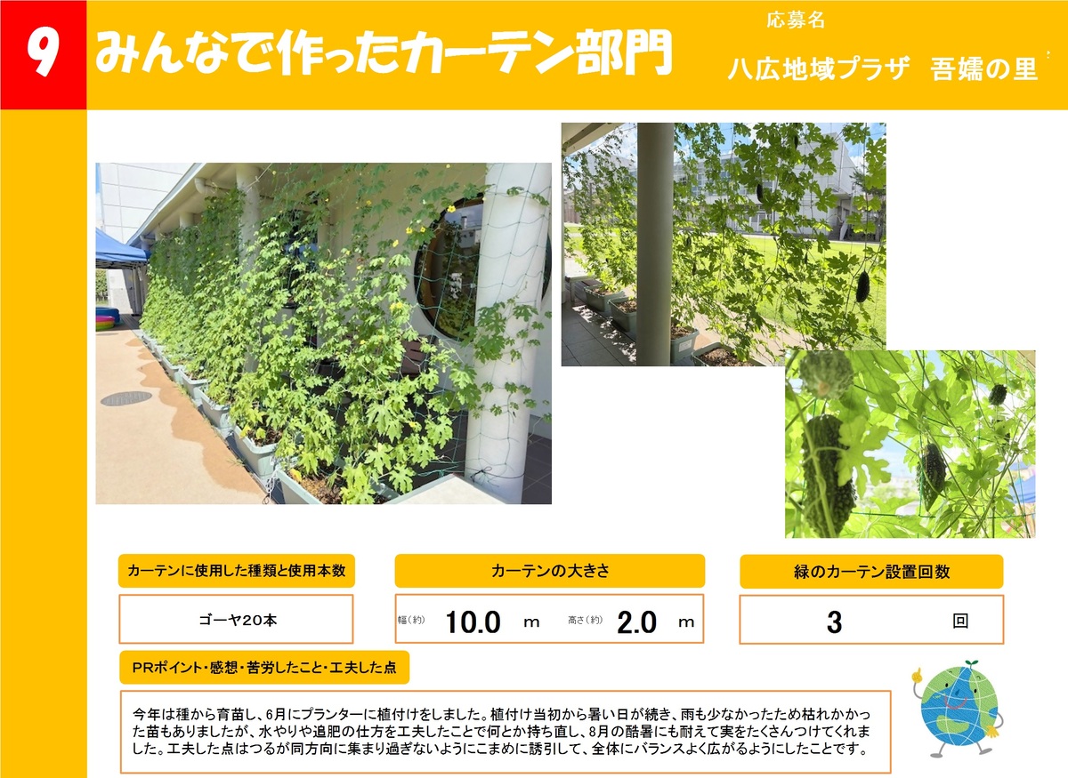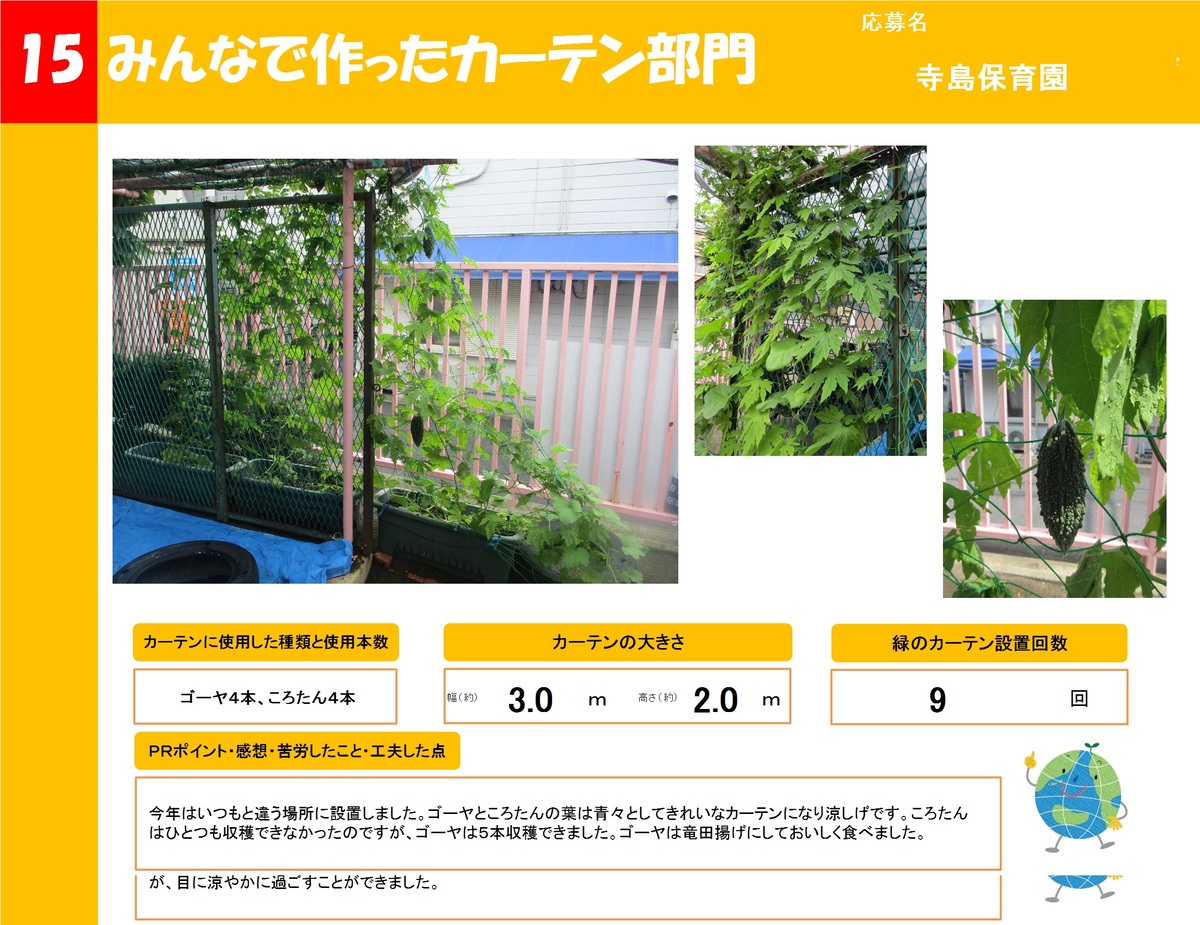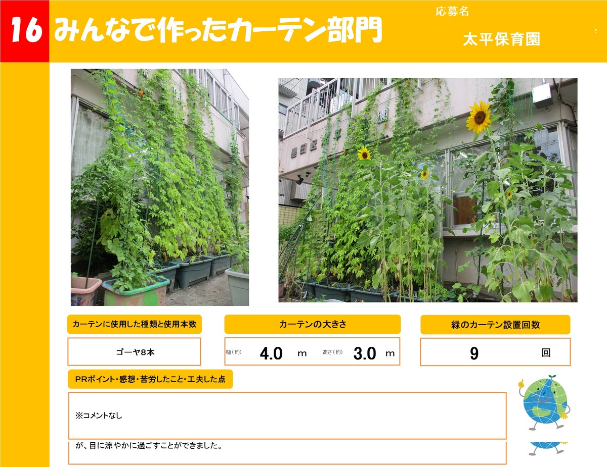 店舗や事業所、公共施設で作った緑のカーテンを16作品ご紹介します。お好きな作品を1つ選び、投票フォームからご投票ください。