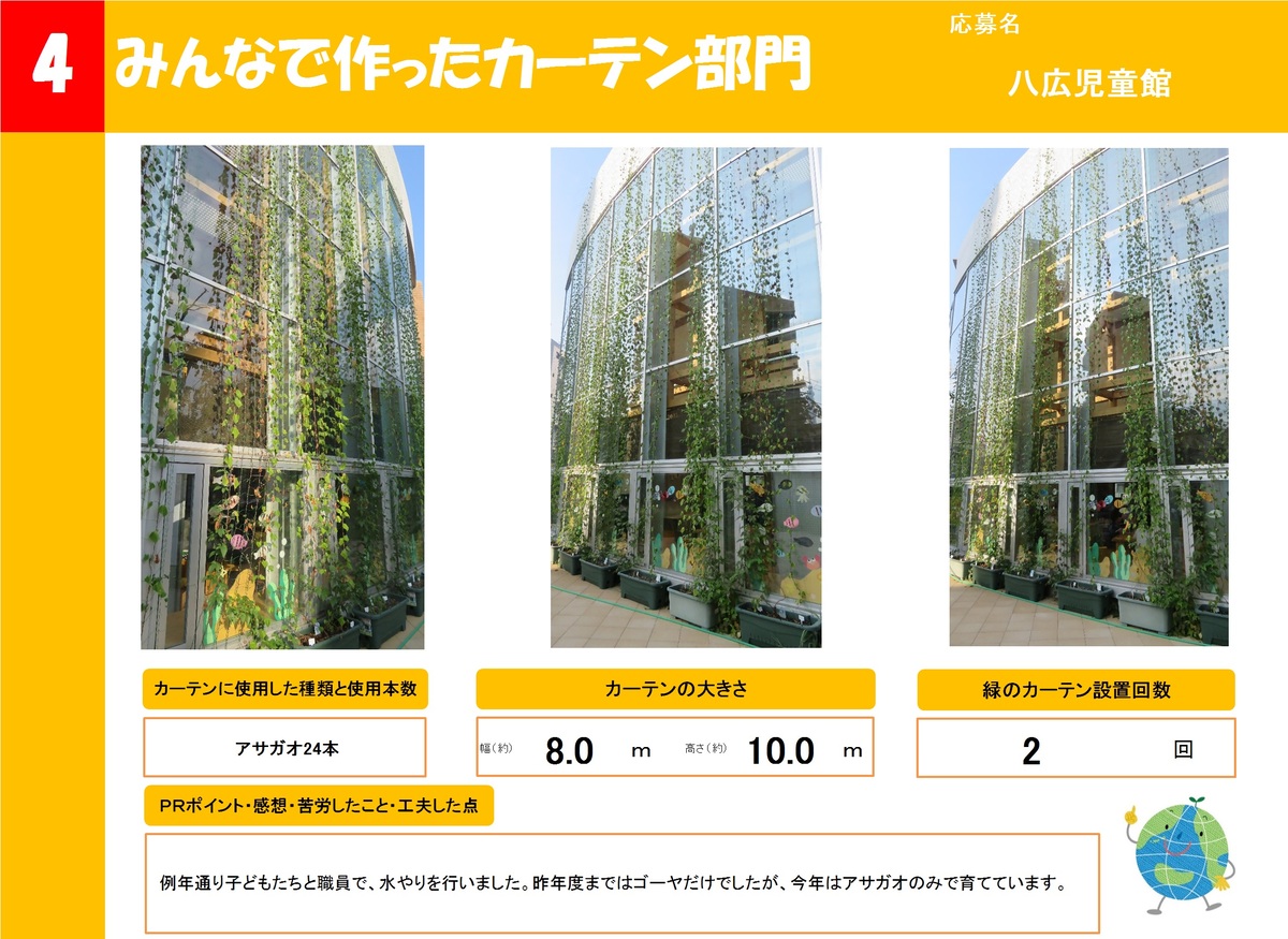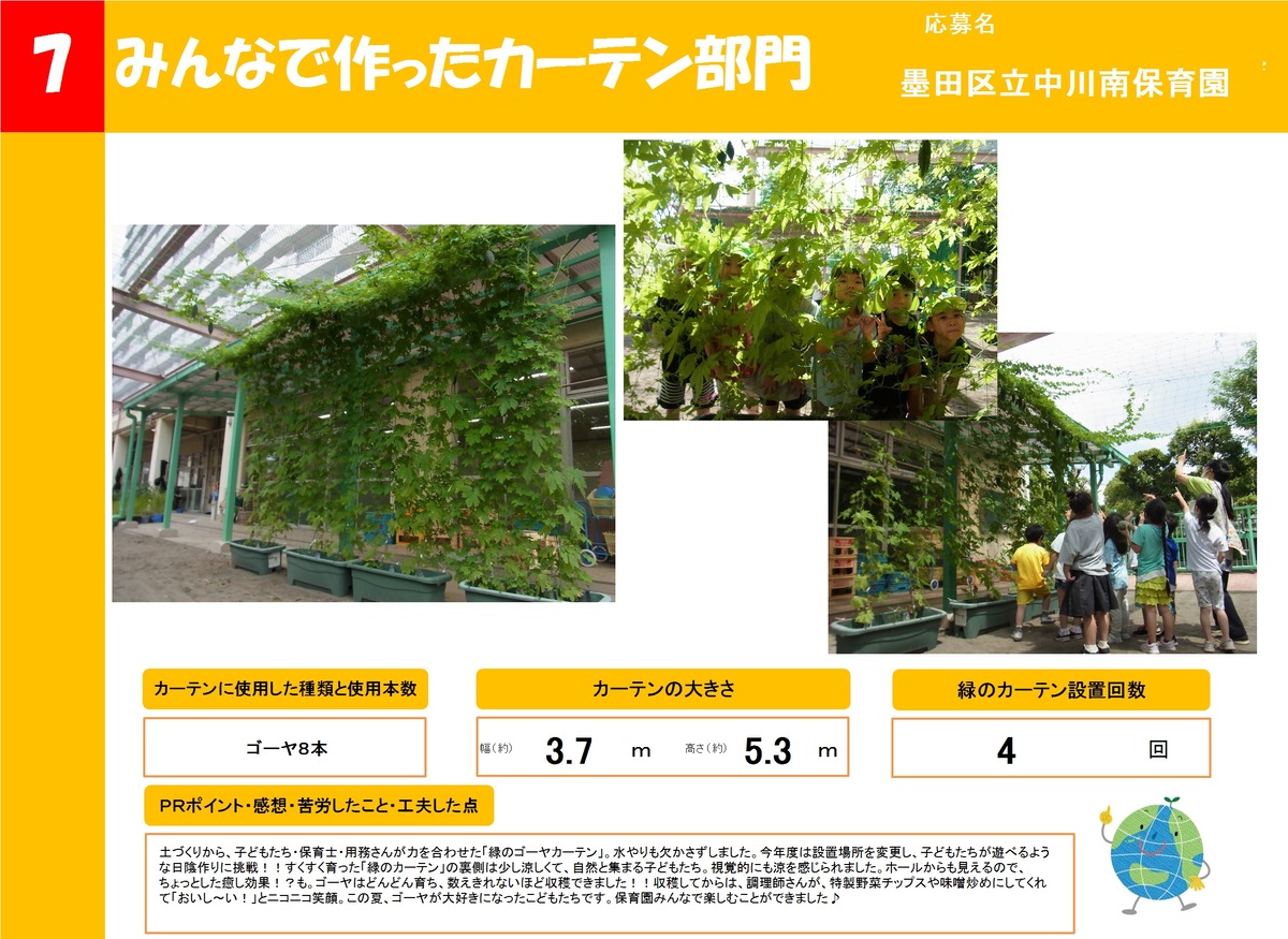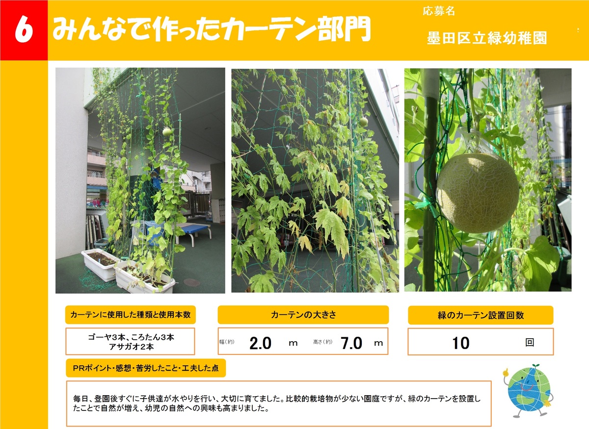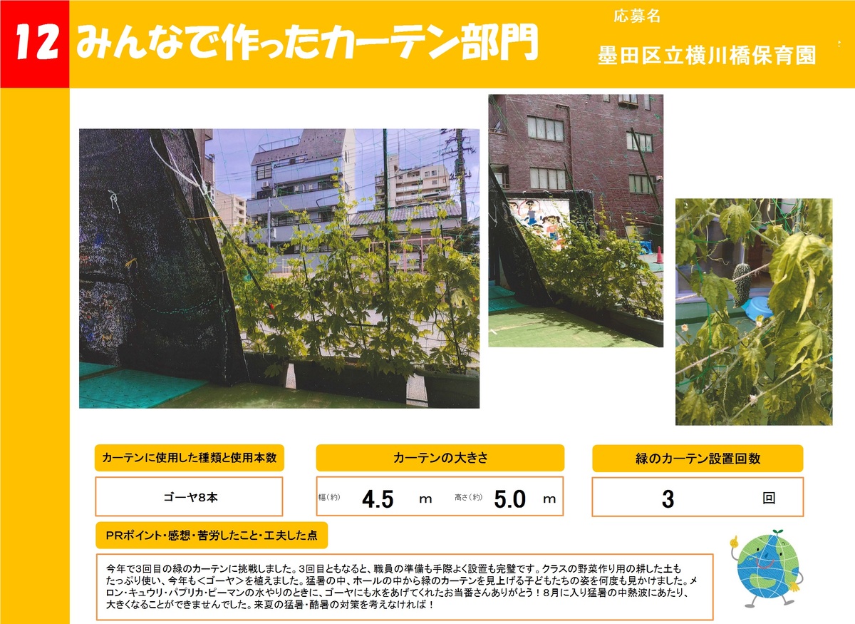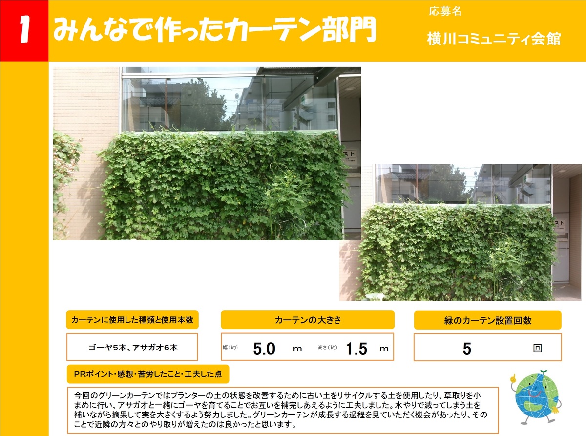 店舗や事業所、公共施設で作った緑のカーテンを16作品ご紹介します。お好きな作品を1つ選び、投票フォームからご投票ください。