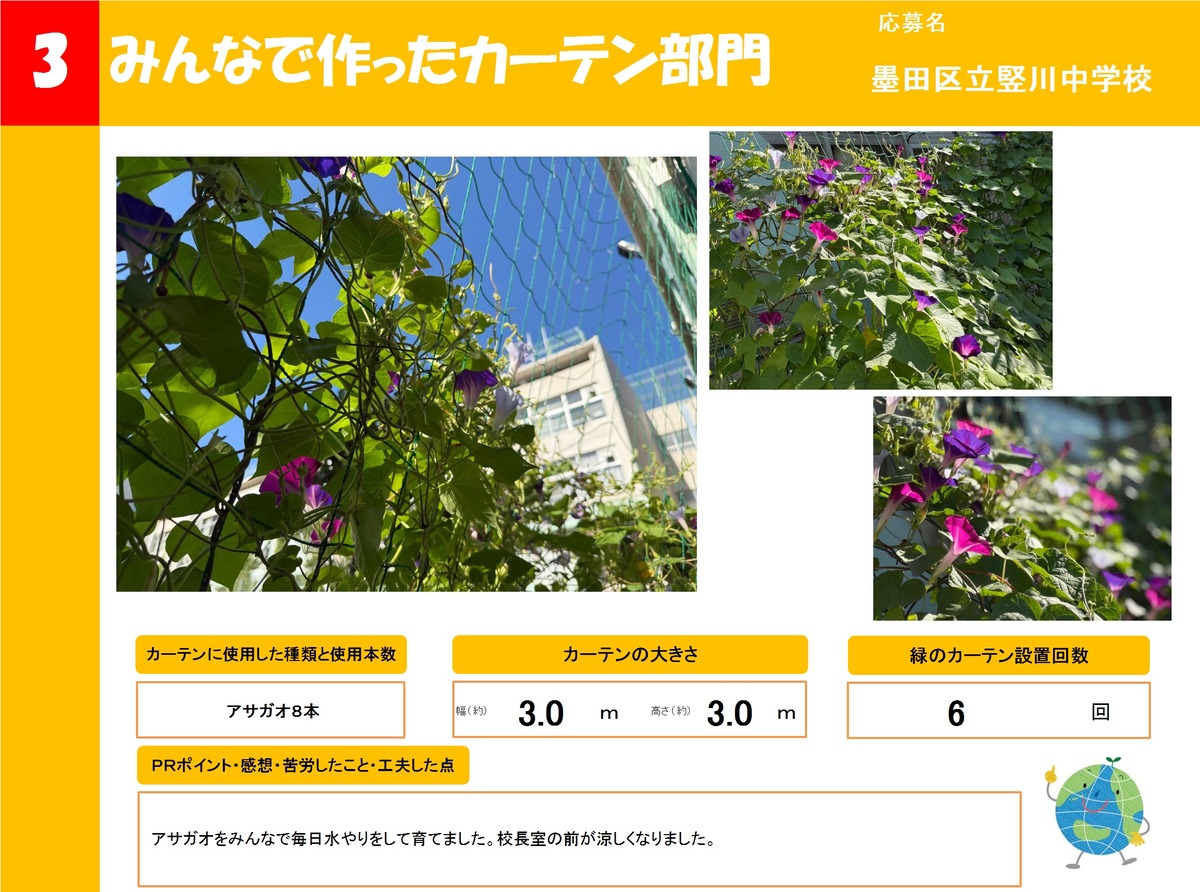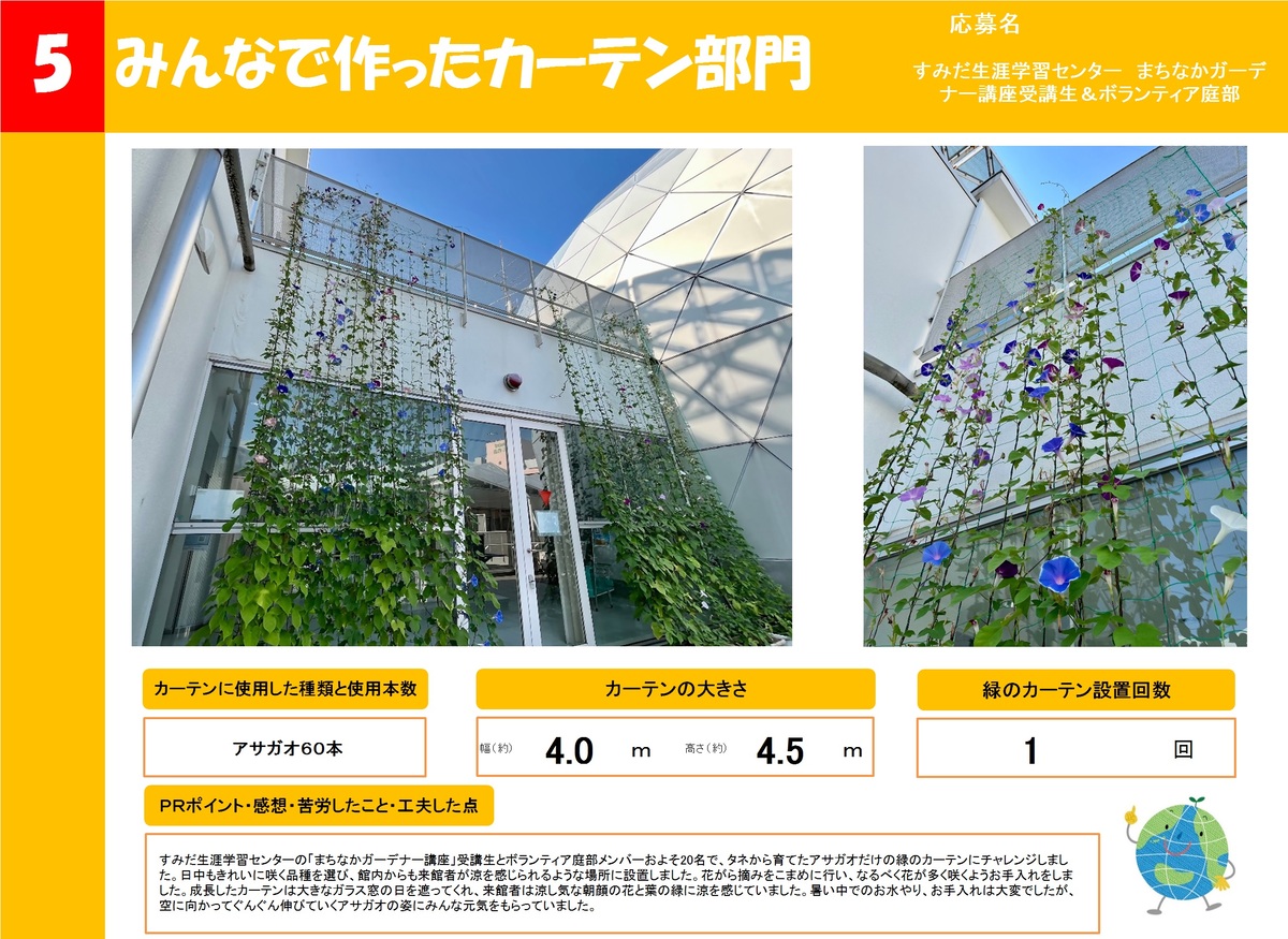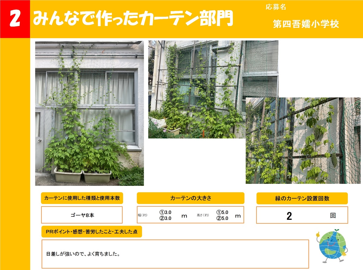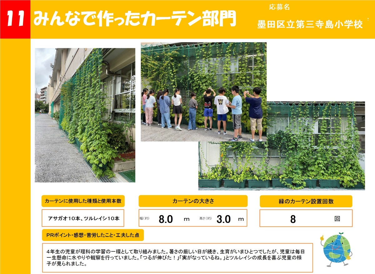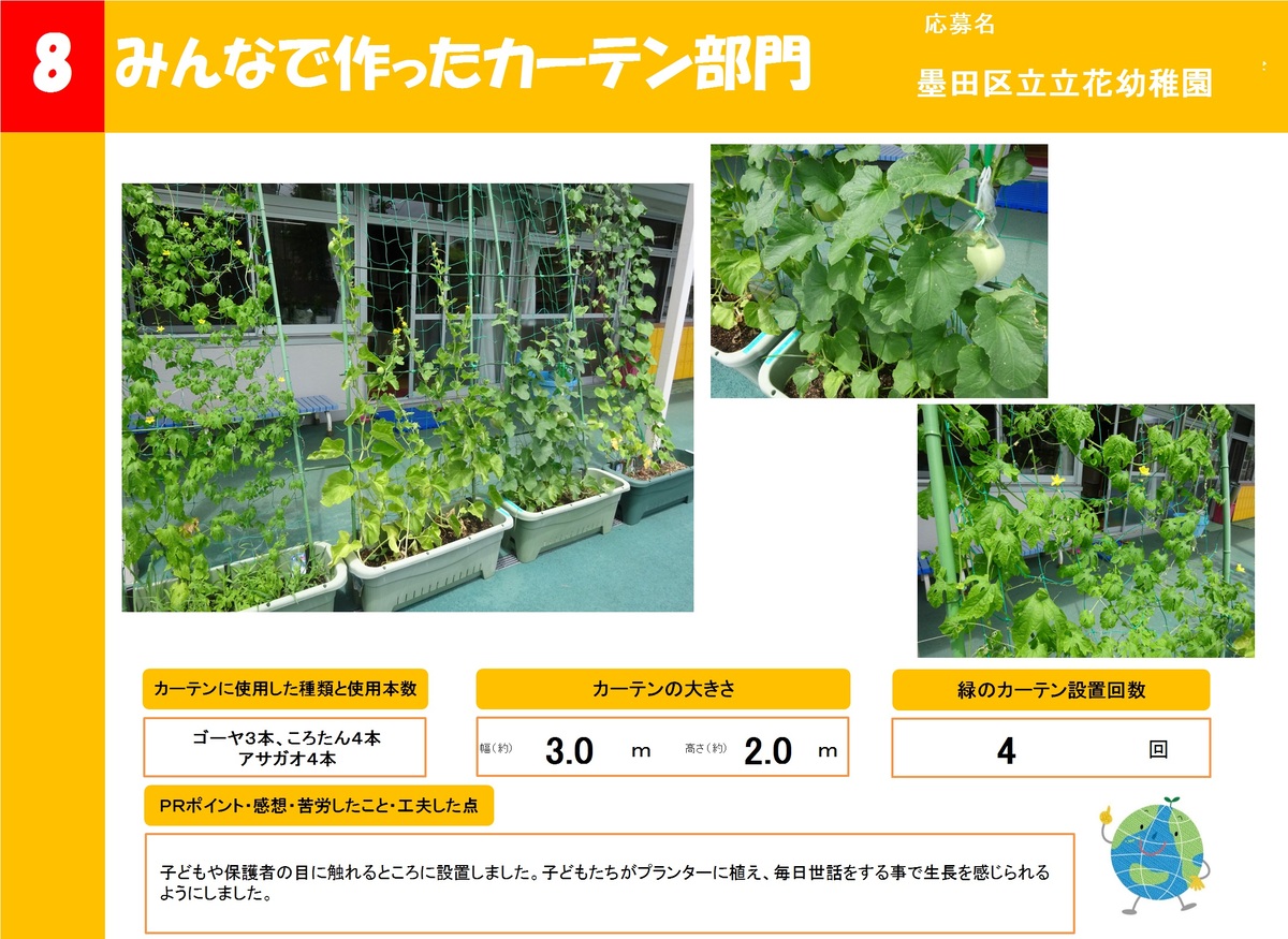 店舗や事業所、公共施設で作った緑のカーテンを16作品ご紹介します。お好きな作品を1つ選び、投票フォームからご投票ください。