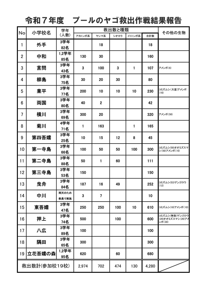 2025年度ヤゴ救出作戦を実施しました。墨田区内の小学校が19校参加(内1校が雨のため中止)、合計4,280匹のヤゴを救出しました。救出したヤゴはトンボに羽化するまで子どもたちが大切に育て、自然に返しました。
