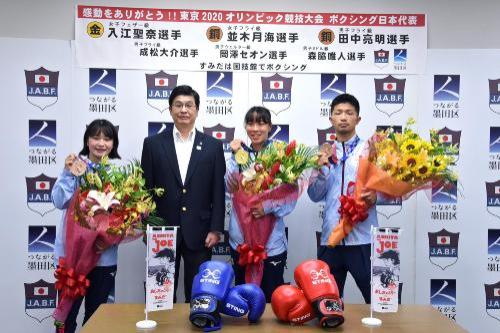 令和3年8月17日(火曜日)に東京2020オリンピック競技大会ボクシング競技(会場:国技館)日本代表の女子フェザー級金メダリスト入江聖奈選手、女子フライ級銅メダリスト並木月海選手、男子フライ級銅メダリスト田中亮明選手が墨田区へ表敬訪問に来られました。
