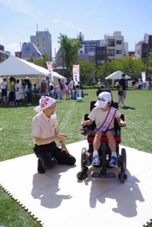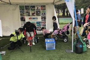 また、東京都が実施しているパラリンピック競技の魅力発信を目的として、パラリンピックの選手を呼び競技体験やトークショーなどを行う「NO LIMITS CHALENGE」も出展されました。1日目は車いすバスケットボールの伊藤 優也選手、2日目はパラリンピックの陸上競技(レーサー)の古畑 篤郎選手による体験会を実施しました。