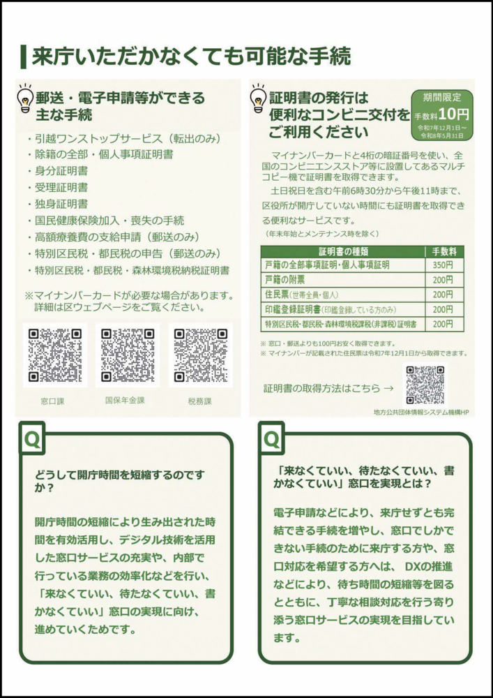 手続のオンライン化、各種証明書のコンビニ交付の推進など、デジタル化による区民サービスの向上を図るため、令和7年12月1日(月曜日)から庁舎の一部の窓口受付時間の見直しを行います。窓口受付時間の見直しにより生み出された時間を活用し、窓口サービスの充実や内部で行っている業務の効率化などを行い、「来なくていい、待たなくていい、書かなくていい」窓口の実現に向け、取組を進めています。