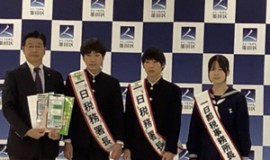 郡さんと枝さんは中学生の「税についての作文」コンクールで本所税務署長賞を、木村さんと都築さんは向島税務署長賞を、花輪さんは東京都墨田都税事務所長賞をそれぞれ受賞し、一日税務署長を務めることになりました。