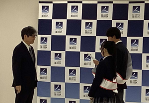 みなさんは区長・教育長と名刺交換した後、マイナンバーカード申告、キャッシュレス納付の利用について協力を依頼、PR用リーフレットを手渡しました。