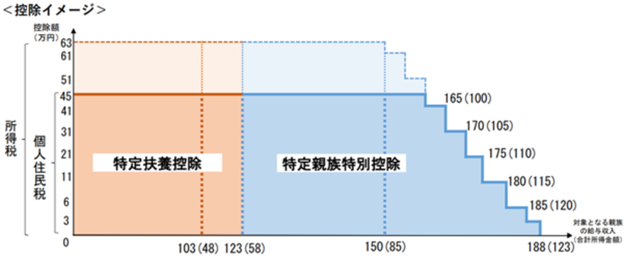令和7年1月1日から12月31日までの収入を基礎とする令和8年度住民税から、年齢19歳以上23歳未満で合計所得金額が58万円超123万円以下の生計を一にする親族(特定親族※)の場合において、新たに特定親族特別控除が受けられます。特定親族特別控除は、下表のとおり特定親族の合計所得金額に応じて控除額が逓減します。