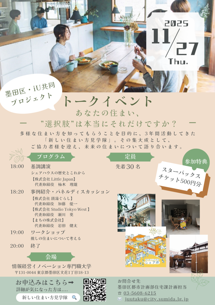 「新しい住まい方見学隊」は、今年で3年目を迎えました。これまでに様々な特色ある住まいを取材してきましたが、本プロジェクトは今年度で終了となります。この取り組みの集大成として、これまで取材にご協力いただいた方々をお招きし、これからの住まい方を考えるトークイベントを開催します。