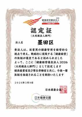 経済産業省が創設し、日本健康会議が認定する「健康経営優良法人」に昨年度東京都内の地方自治体では墨田区が初めて認定されましたが、今年度も「健康経営優良法人2026大規模法人部門」に引き続き認定されました。