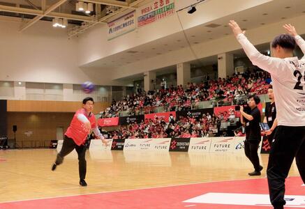 今シーズンのひがしんアリーナ開幕戦となる10月9日(木曜日)の試合では、山本区長の始球式でスタート。その後、ハーフタイムに大勢のファンの前で、山本区長とジークスタースポーツエンターテインメント株式会社の黒田社長が協定書に調印を交わしました。試合では、前半こそ苦戦を強いられたものの、後半の怒涛の得点により見事29―27での大逆転勝利を収めることができました。