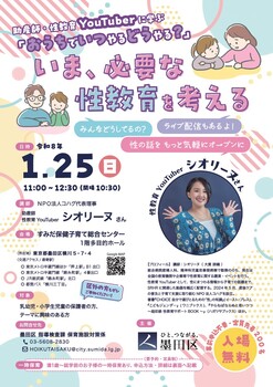 今年度の講演会では、性教育YouTuberとして17万人以上の登録者を持つシオリーヌさんをお招きし、包括的性教育の考え方や、「性と生殖に関する健康と権利(SRHR)」について解説します。また、家庭での実践方法として、子どもの年齢に応じた伝え方や素朴な質問への対応方法など、具体的な事例を交えてわかりやすくお話しいただきます。