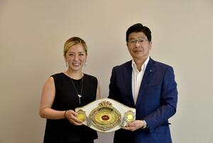 墨田区鐘ヶ淵の一力ジム所属で、女子ボクシング日本アトム級チャンピオンのモンブランみき選手が来庁し、4月30日の王座決定戦で初戴冠したことを報告してくれました。