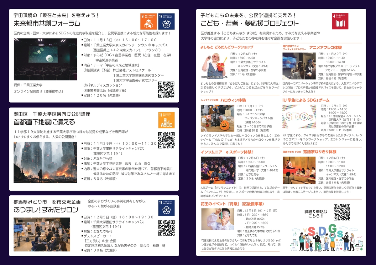 また、「こども・若者・夢応援プロジェクト」と題し、区が推進する”こどもまんなか すみだ”の実現に向けて、すみだを支える事業者や大学等の協力により、子どもたちの夢を育む様々な企画を実施します。