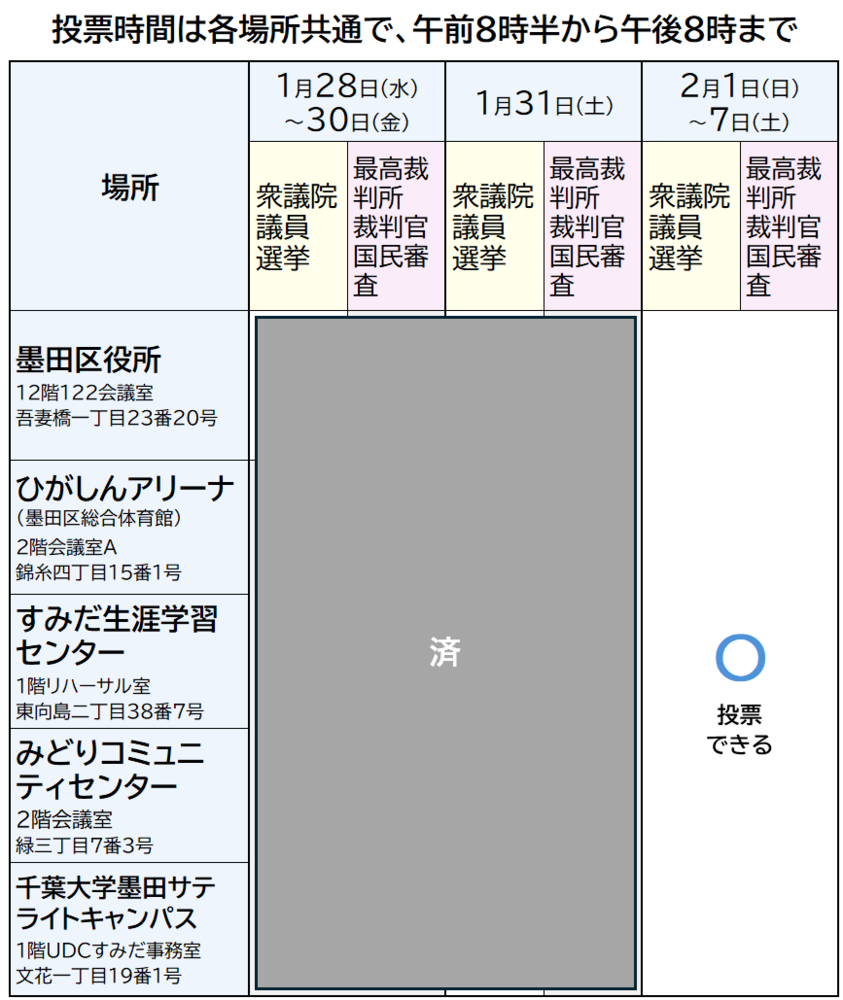 - 令和8年1月15日以降に墨田区内で住所を移した方は、前住所地の投票所で投票となります。