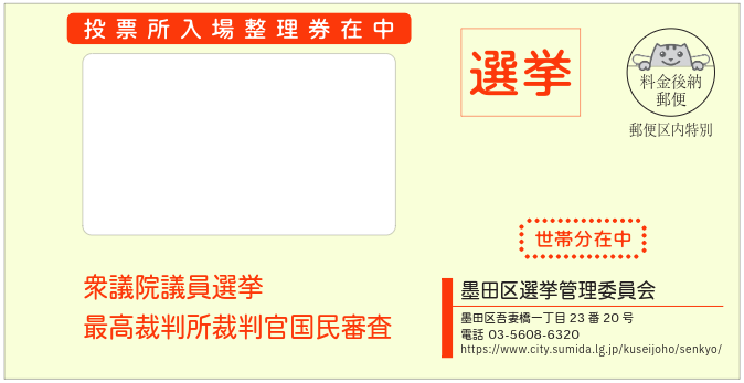 - 墨田区の選挙人名簿に登録されていない方でも、前住所地で投票できる場合があります。前住所地の選挙管理委員会に、ご確認ください。