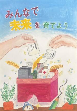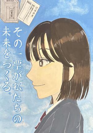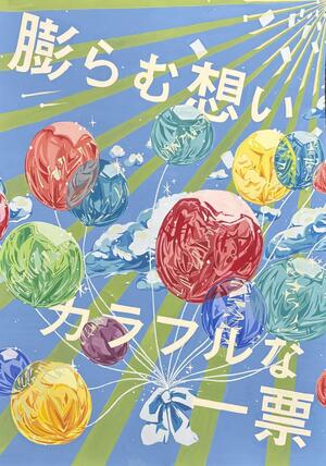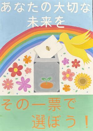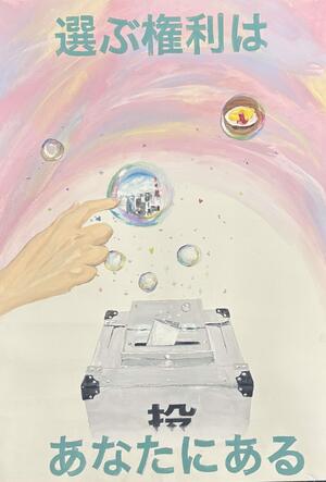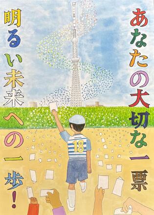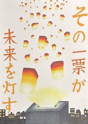 「あなたの大切な一票明るい未来の一歩!」は色合いが明るく、みんなの票が空に舞い上がる様子から