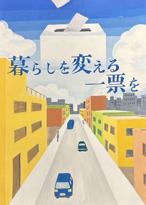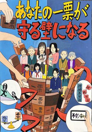 高齢者や子育て世代、学生など、多様な世代を描くとともに、生活の保障につながる壁として一票を描くなど、