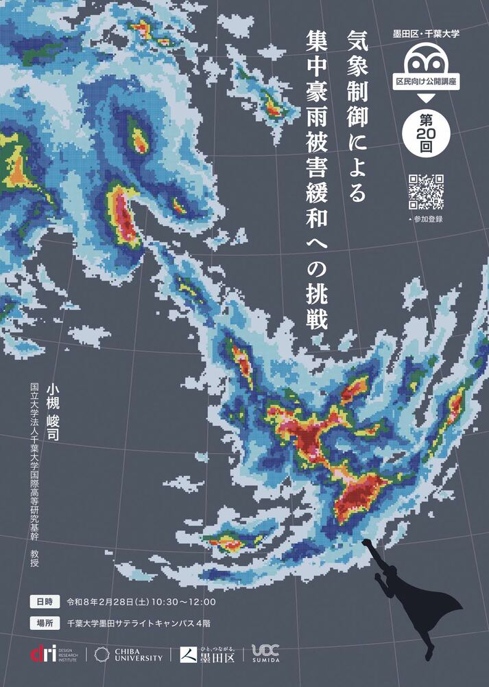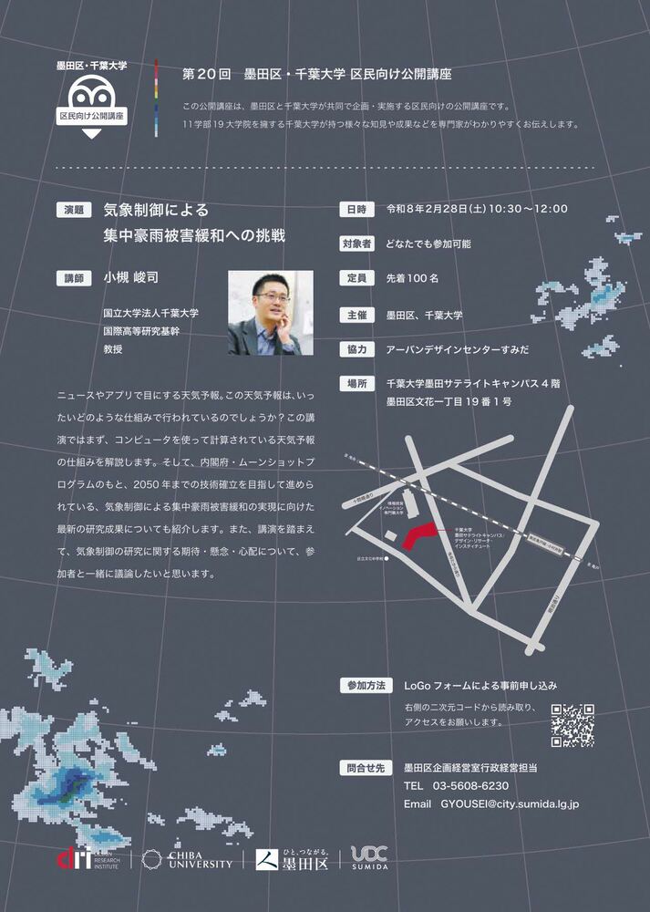 本講演では、千葉大学国際高等研究基幹の小槻峻司教授をお迎えし、天気予報の仕組みに加え、小槻教授がプロジェクトマネージャーを務める「内閣府・ムーンショットプログラム」のもと、2050年までの技術確立を目指して進められている、気象制御による集中豪雨被害緩和の実現に向けた最新の研究成果についてご紹介します。