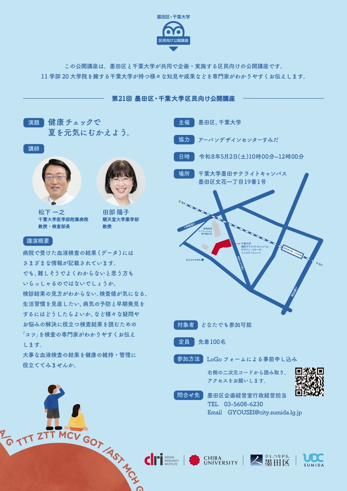 本講演では、千葉大学医学部附属病院の松下一之教授・検査部長、順天堂大学薬学部の田部陽子教授をお迎えし、「検診結果の見方がわからない」「検査値が気になる」「生活習慣を見直したい」「病気の予防と早期発見をするにはどうしたらよいか」など、様々な疑問やお悩み解決に役立つ検査結果を読むための『コツ』について、検査の専門家がわかりやすくお伝えします。