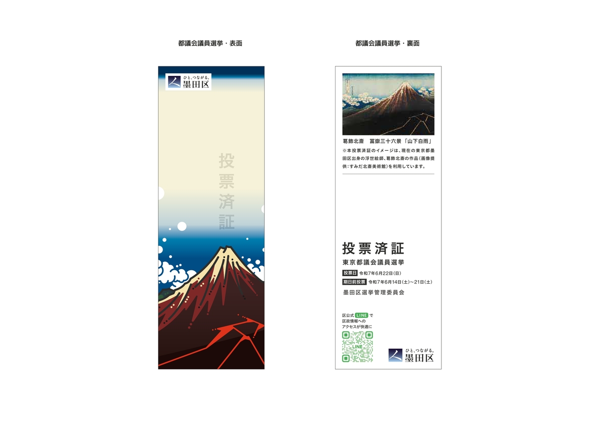 今回の令和7年6月の都議会議員選挙では、その第2弾として、冨嶽三十六景「山下白雨」を採り入れた投票済証を制作しました。