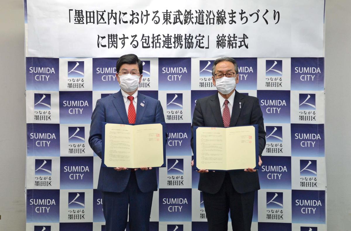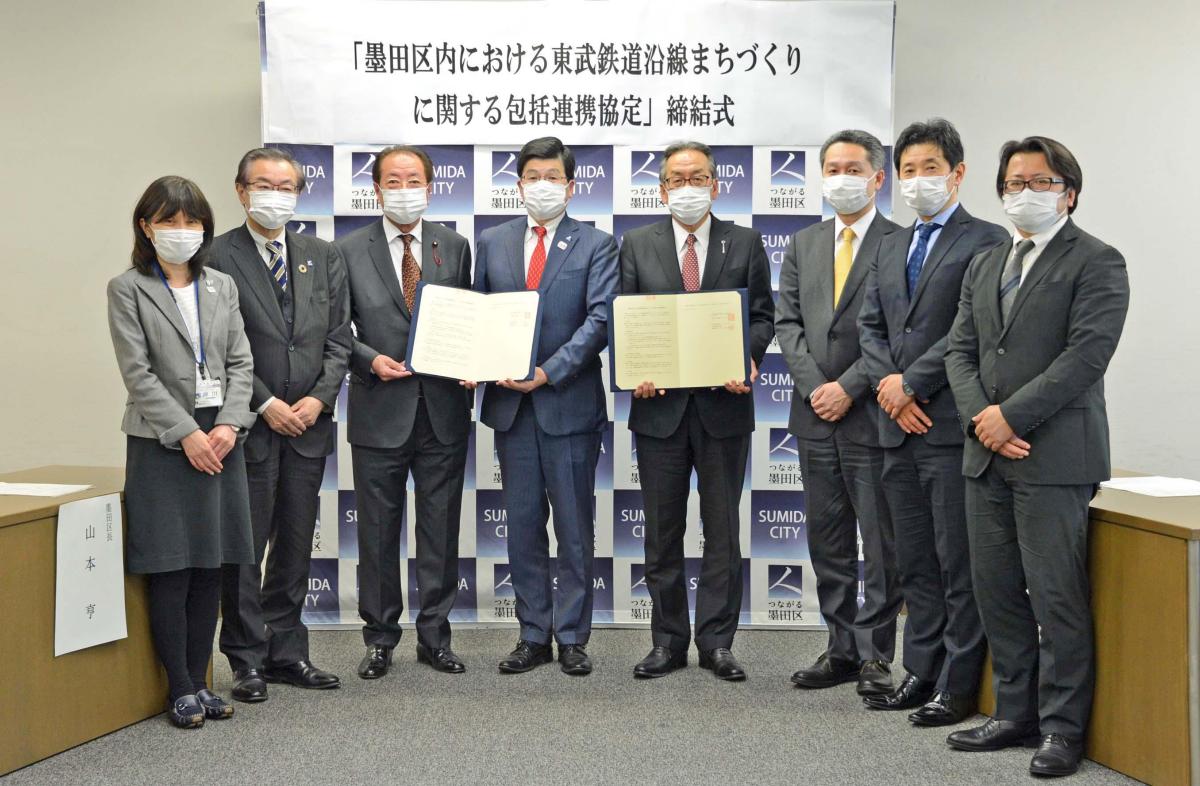 墨田区は、令和3年4月7日に東武鉄道株式会社との間で、「墨田区内における東武鉄道沿線まちづくりに関する包括連携協定」を締結しました。