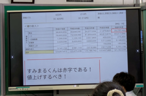 生徒たちは、区のお知らせや区から提供された資料をもとに、区内循環バス事業の現状を学習したうえで、今後もバスが運行するための解決策を発表しました。