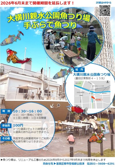 なお、大横川親水公園魚つり場は、リニューアル工事のため令和8年8月から令和9年9月末まで利用を休止する予定です。