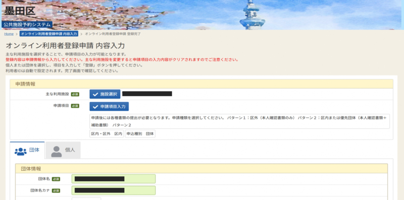 - 利用する施設や登録する区分によって入力内容が異なるため、施設選択後の申請項目をよくご確認の上、入力してください。