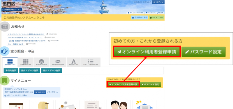 公共施設利用システムのトップ画像から「オンライン利用者登録申請」ボタンを押下し、メールアドレスの登録を行います。