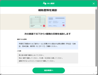 完了画面にある「本人確認書類提出はこちら」を押下するか、システムから送信されるメールのURLから本人確認書類提出用のサイトに遷移してください。