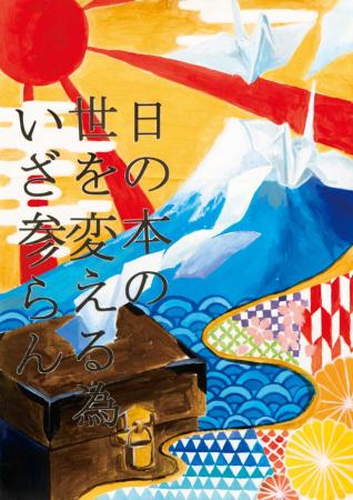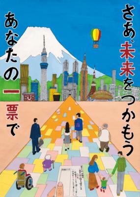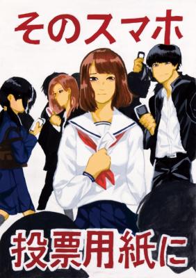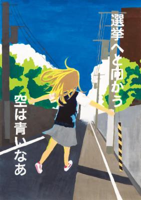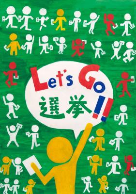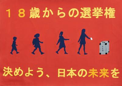 ・投票箱に向かう人物のシルエットが鮮やかで明快な背景の色調と相まって、デザイン性に優れた画面構成となっている。若者が選挙に行くことの大切さ、”日本の未来を決めるのは自分たちである”という、18歳からの選挙権を強く意識した作品である。