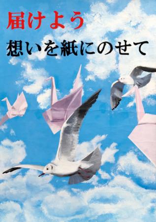 ・青空をはばたく鳥と、投票用紙に見立てた折り鶴の構図が画面全体に躍動感を与えている。