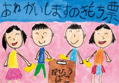 ・選挙を1年生の目線からイメージし、行動すること、協力し合うことについて一緒に考えたくなる作品。優しさや温かさが豊かに表現されている。