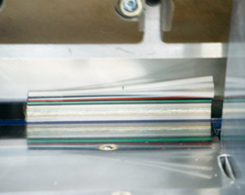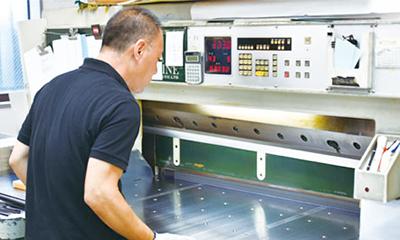 そして、のりが乾いた後、のり付けした場所以外の3辺を、長さ1メートル15センチメートルの刃が付いている断裁機で切り整えます。これを「三方断裁」というそうです。断裁機は、製本用やメモブロック用など、それぞれに専用の物があるそうです。