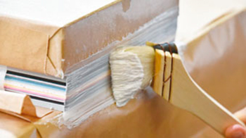 こうして土台が完成した後は、いよいよのり付け作業です。紙が少しでもずれるとうまくのりが付かないので、時間を掛けて丁寧に紙をそろえました。これはとても大切な作業です。そして、メモブロックの1辺に