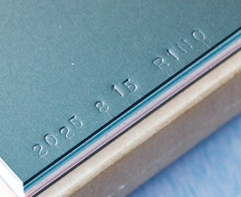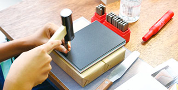 最後に、ハンマーを使い、表紙の厚紙に自分の名前や日付などを刻印して、メモノートが完成しました。