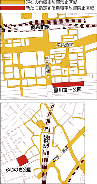 11月15日から錦糸町駅および曳舟駅周辺の自転車放置禁止区域を追加指定します。区域内に放置された自転車等は、即時撤去の対象となります。