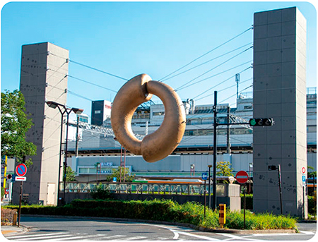 JR錦糸町駅北口のモニュメントは、「𝄢(ヘ音記号)」がモチーフ!また、それをつるすワイヤーは、「五線譜」を表しています。