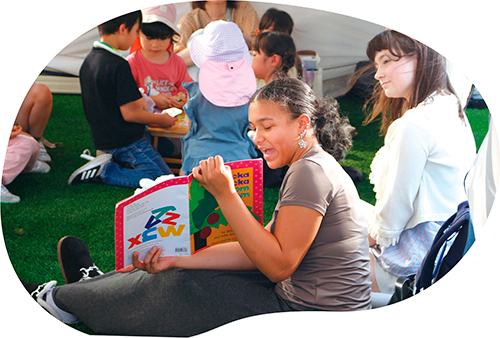 7年6月には、京成曳舟駅前で実施された本のイベント「夕涼みブックナイト」に参加し、学生たちが英語絵本の読み聞かせを行い、会場を訪れた皆さんと交流を深めました。