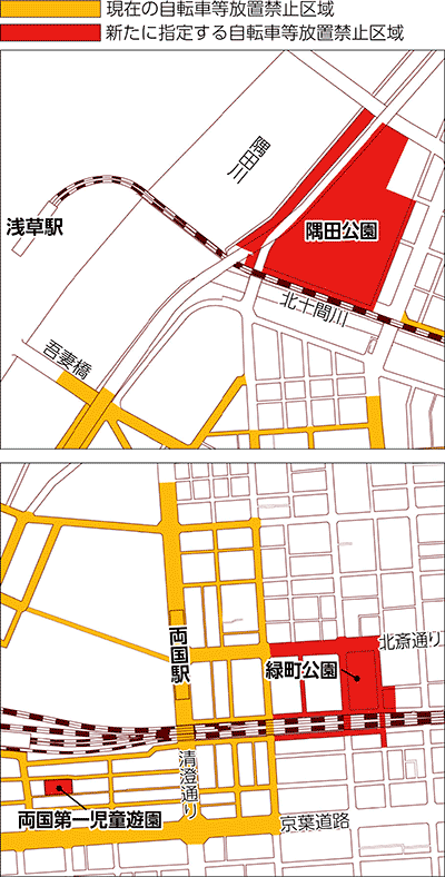 4月1日から、浅草駅および両国駅周辺の自転車等放置禁止区域を追加指定します。区域内に放置された自転車等は即時撤去の対象となりますので、ご注意ください。